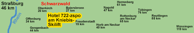 Leonberg (30 km), Böblingen (30 km), Bad Herrenalb (33 km), Stuttgart (40 km) und Karlsruhe (53 km).