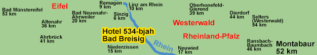 Kloster Eberbach (14 km), Eltville, Lorch, Wiesbaden, Mainz und Loreley.